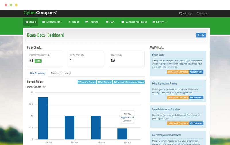 Automated cyber risk management and HIPAA compliance software that does not require you to be an expert.Protect Your Practice. Protect Your Patients.Can take as few as 2 hours to complete the assessment.A Security Risk Assessment is required annually for MACRA and HIPAA.Prioritized corrective actions provided in CyberCompass.HIPAA Employee Training with completion and competency tracking (up to 50 seats).Updated Policy and Procedures.Simplify Business Associate Agreements and Management.